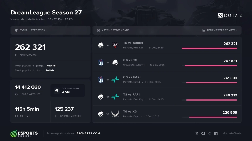 Интерес к лиге остается стабильно высоким. Предыдущий 26-й сезон DreamLeague (май–июнь 2025 года) показал практически идентичный результат — 261 тысяча зрителей в пике. Текущий турнир смог побить эту планку, пусть и с минимальным перевесом.