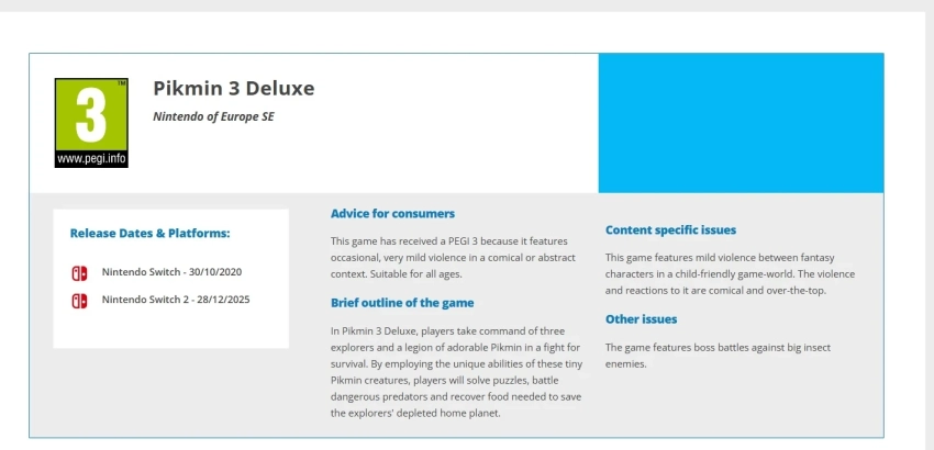 Обложка: скриншот игры Pikmin 3 DeluxeЕвропейское агентство Pan European Game Information выдало возрастной рейтинг Deluxe-изданию Pikmin 3 для Nintendo Switch 2. Это может намекать на скорый релиз.