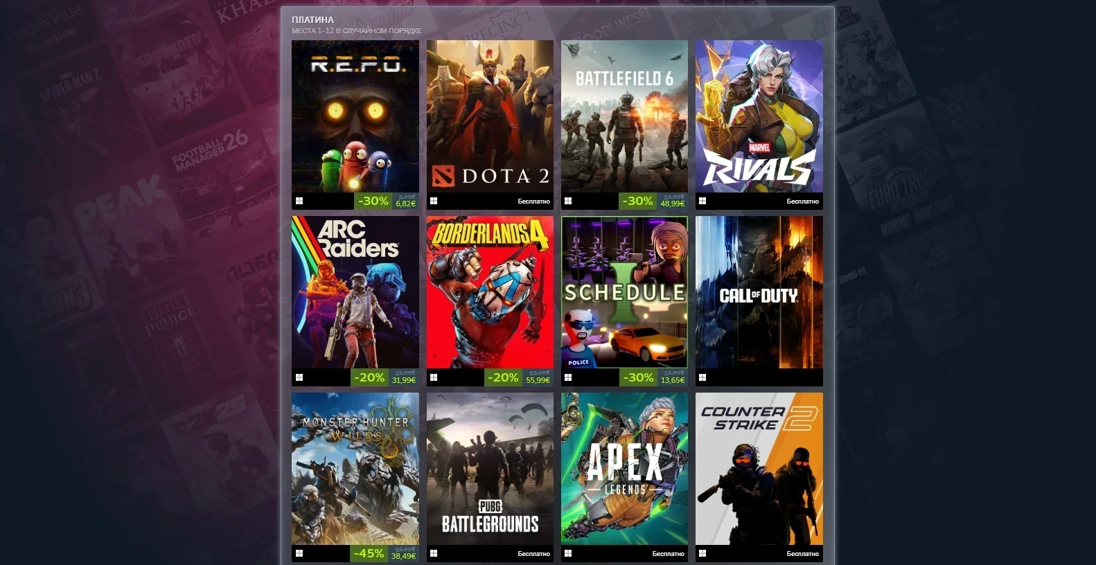 Но из платных новинок 2025 года следует отметить те же Battlefield 6, ARC Raiders, Schedule I, Borderlands 4, Call of Duty: Black Ops 7, R.E.P.O. и Monster Hunter Wilds. Напомним, игры в списке внизу расположены в случайном порядке.