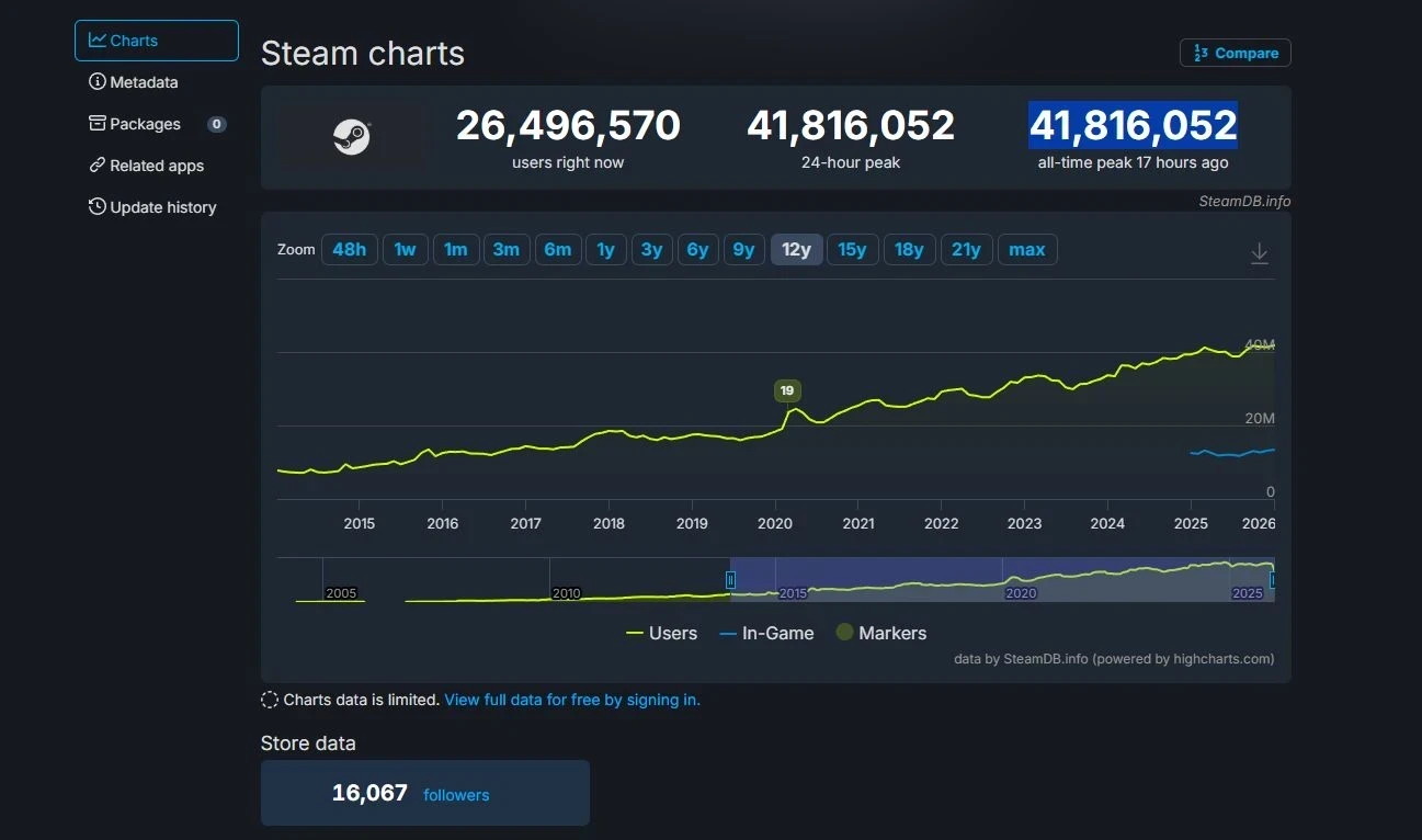 Обложка: лого SteamНачало января отметилось для Steam новым рекордом по пиковому онлайну — 41,816,052 человек. Его установили 17 часов назад.