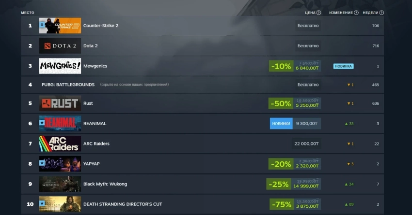 В российском сегменте Steam у Mewgenics также получилось стать самой прибыльной платной игрой, заняв третью строчку в чарте — вперёд выбились Counter-Strike 2 и Dota 2. А ещё одной февральской новинкой в списке стала Reanimal, которую высоко оценил автор Игромании в развёрнутой рецензии. Также в топ-10 вернулись Black Myth: Wukong и Death Stranding, занявшие девятое и десятое места соответственно.