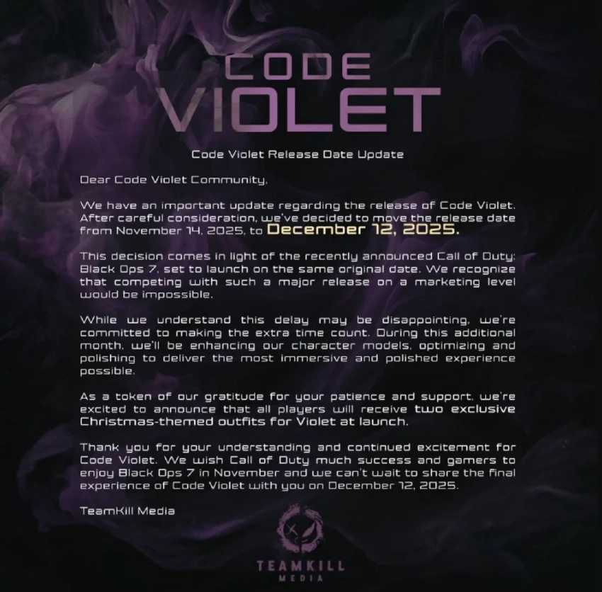Авторы Code Violet боятся конкуренции с Call of Duty: Black Ops 7, чью дату релиза 14 ноября объявили на церемонии открытия gamescom 2025. Шутер из сверхпопулярной серии может затмить хоррор с точки зрения маркетинговой кампании — релиз Code Violet попросту бы прошёл мимо массовой аудитории. Однако разработчики не собираются сидеть сложа руки.