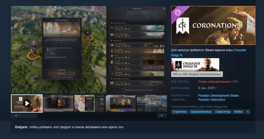 И второй — основным приоритетом для команды является масштабное дополнение All Under Heaven, поэтому на создание Coronation выделили куда меньше ресурсов. В будущем авторы игры постараются не допускать подобных просчётов.