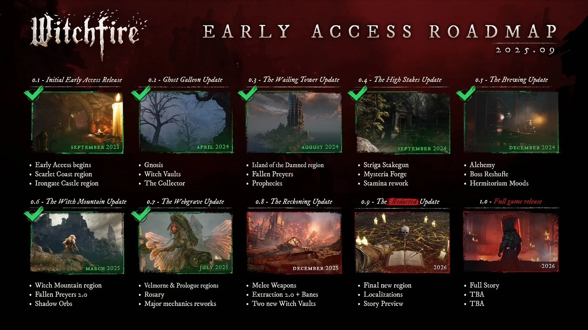 Следующее обновление Witchfire — 0.8 или The Reckoning — запланировано на первую половину декабря 2025 года. Разработчики доработают большую часть игровых функций и механик (на карте отмечены холодное оружие и испытания Banes), улучшат алхимию, арканы, пророчества и многое другое. Что до Extraction 2.0, то с ним «повысится напряжение на высоких уровнях Гнозиса».